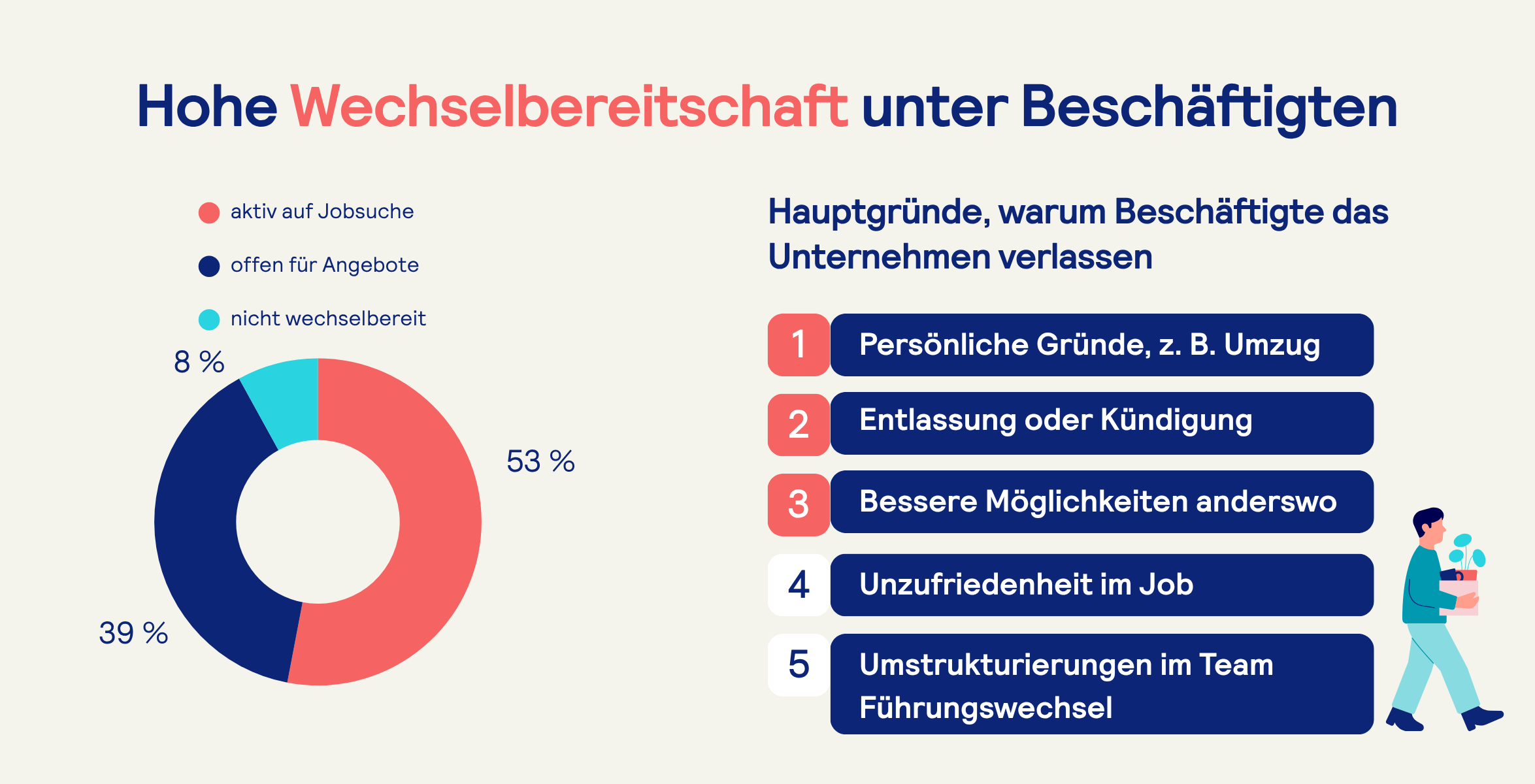 Aufgrund des Arbeitskräftemangels sind die Zeiten für gut qualifizierte Arbeitnehmer*innen trotz schwächelnder Wirtschaft vorteilhaft. Das spiegelt sich in einer hohen Jobmobilität wider: