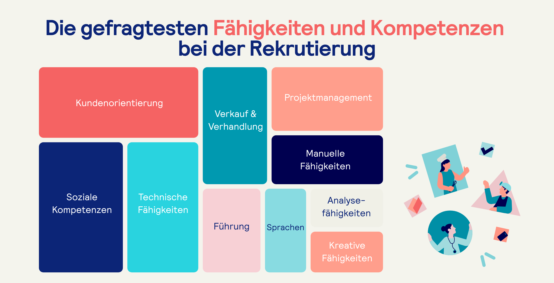 Abgesehen von fachspezifischen Kompetenzen stehen auch Behavioral Skills wie Service- und Kundenorientierung, sowie soziale Kompetenzen wie kritisches Denken, Kommunikationsfähigkeiten ganz oben auf der Anforderungsliste der Recruiter*innen.