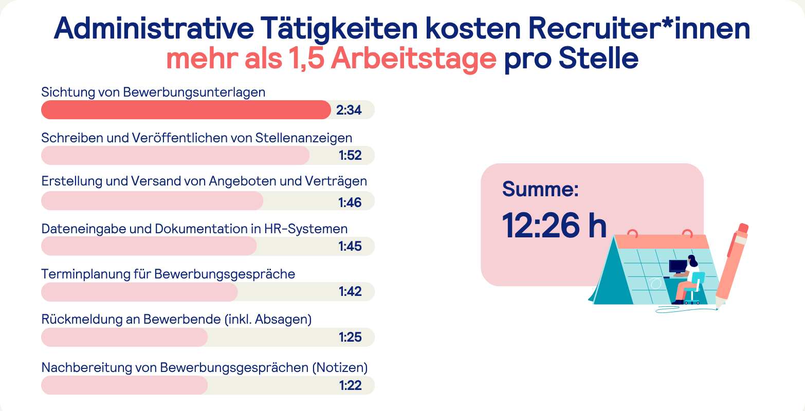 Administrative Tätigkeiten kosten Recruiter*innen mehr als 1,5 Arbeitstage, was jährlich rund 6.700 € an versteckten Personalkosten pro Recruiter*in entspricht.1